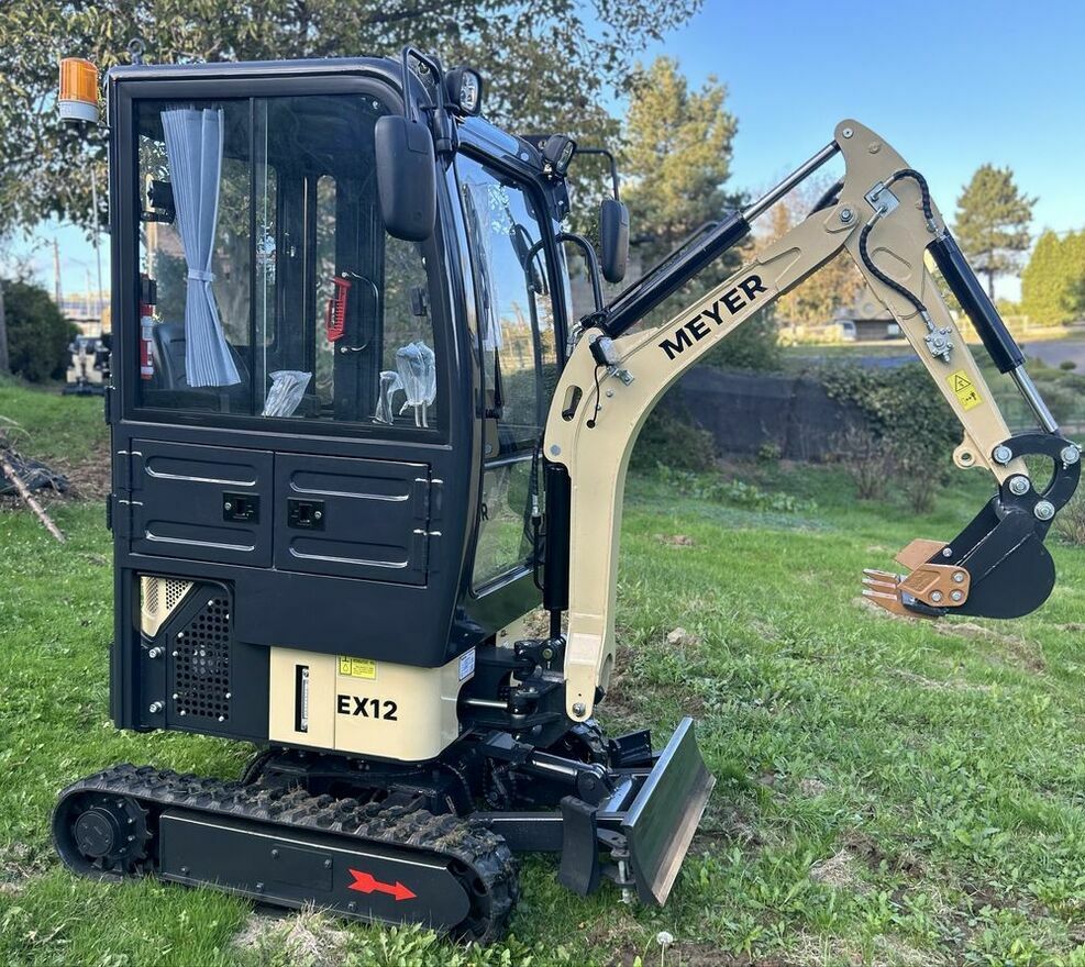 Minikoparka gąsienicowa MEYER EX12 z kabiną, rozsuwanymi gąsienicami, skrętnym ramieniem i joystickiem to wszechstronna i kompaktowa maszyna o masie 1,35 tony, idealna do prac ogrodowych, brukarskich, budowlanych i przyłączeniowych.